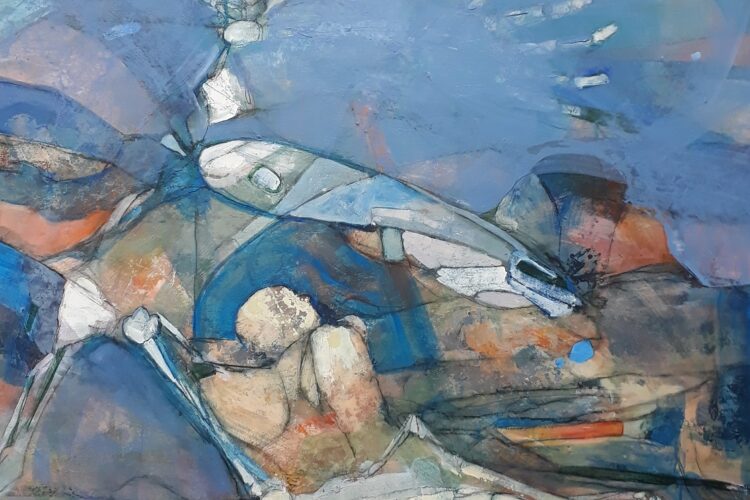 Drawing without intention, painting with no purpose. This was an exercise in starting a painting without any sense of what it might become. The method involved reproducing a sketch, rotating the canvas and superimposing another sketch on the first, until forms began to emerge. The result was four paintings each a metre square.